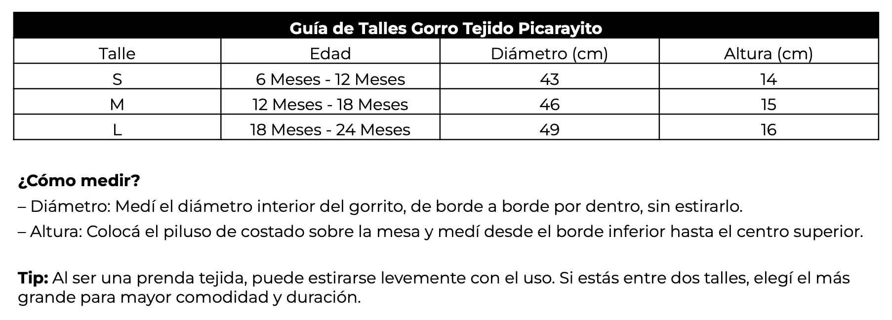 - Talla S (6 meses – 12 meses): 43 cm diámetro y 14 cm de alto.