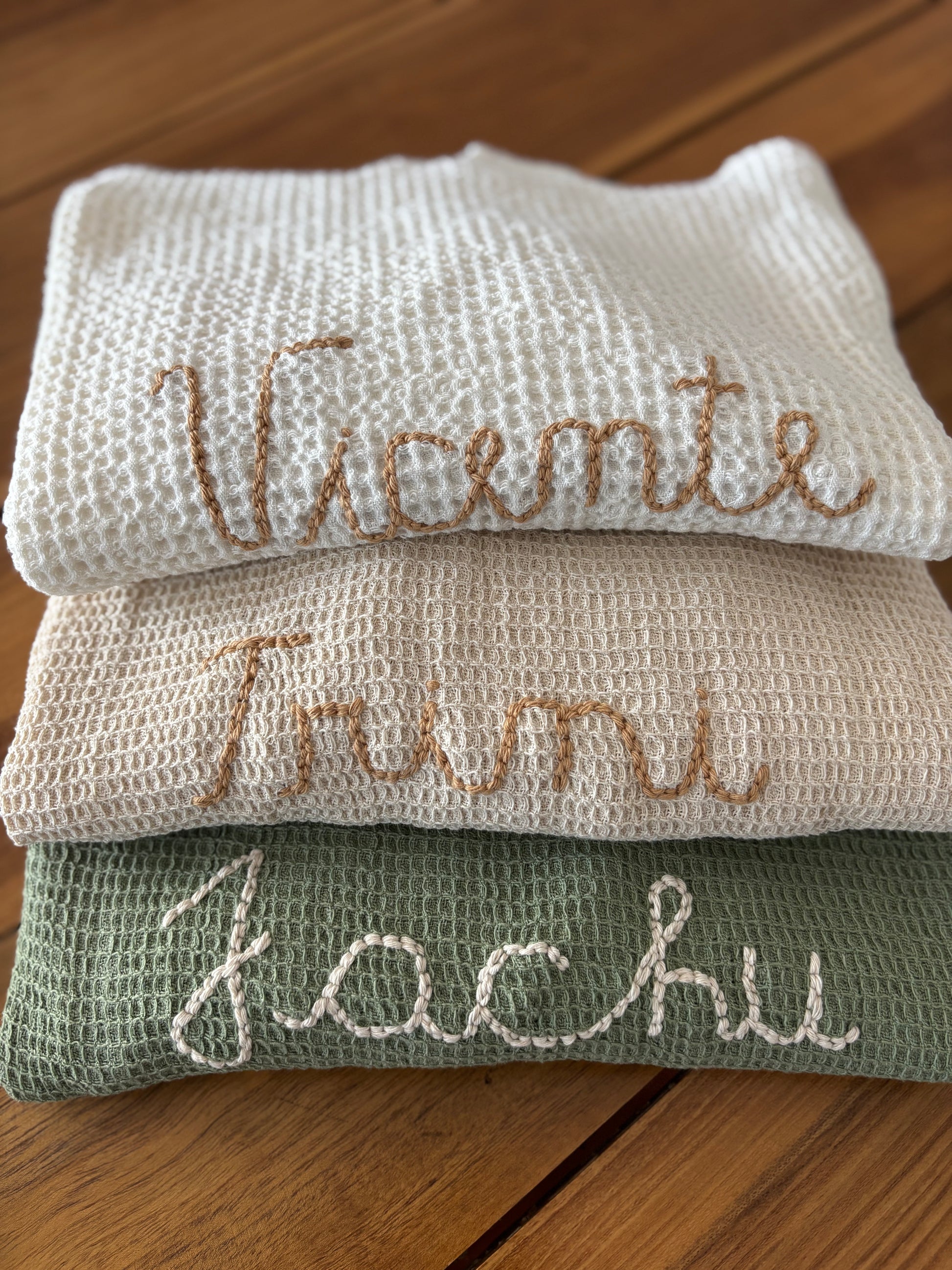 Se pueden personalizar únicamente por encargo. Podes añadir el nombre bordado del bebé en la paleta de colores que vos desees.