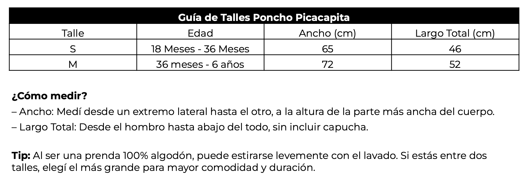 - Talla S (18 meses – 36 meses): 65 cm ancho x 46 cm largo. Recomendado para niños de 80 a 95 cm de altura.